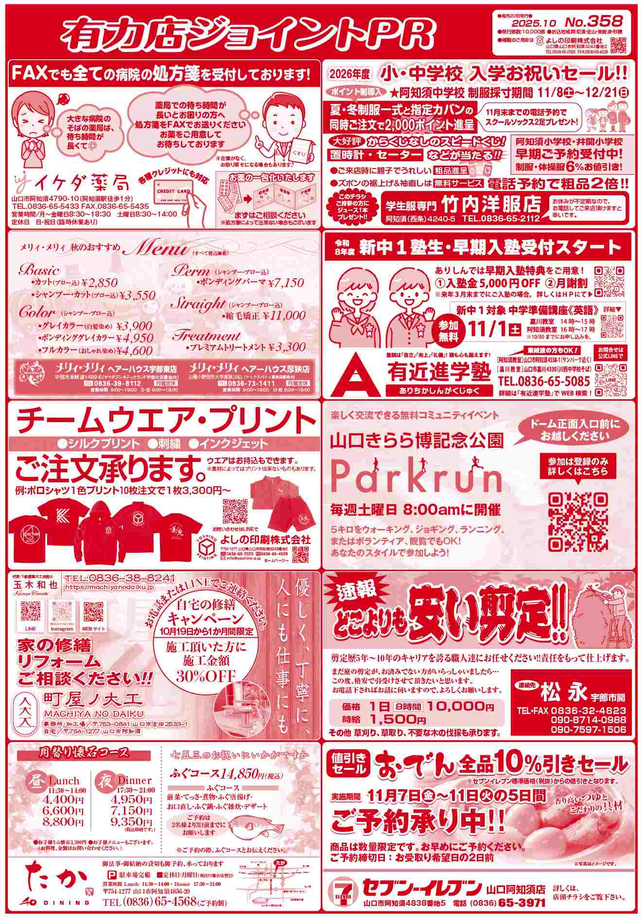 伊藤工建様、有限会社林クリーニング本店様、イシイバレエ様、有限会社岡村電器様、School Shopタケナガ様、ギフト フィーロ267様、京きもの ふるや様、生長の家 山口県教化部様、お食事処 菊水様、イケダ薬局様、メリィ・メリィヘアーハウス宇部東店・厚狭店様、町屋ノ大工様、和ダイニングたか様、竹内洋服店様、有近進学塾様、山口きらら博記念公園parkrunパークラン様、松永剪定様、セブンイレブン山口阿知須店様