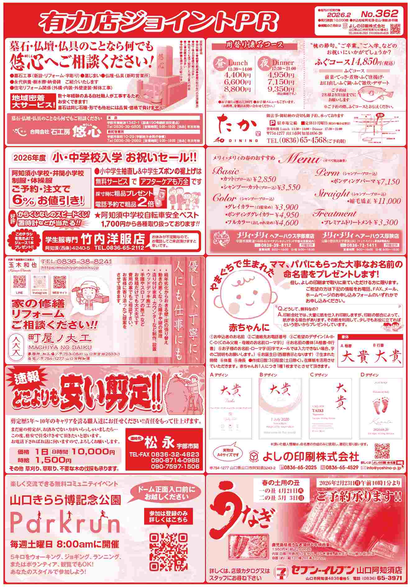 石工房 悠心様、竹内洋服店様、町屋ノ大工様、松永剪定様、parkrun山口きらら博記念公演様、和ダイニングたか様、メリィ・メリィヘアーハウス宇部東店・厚狭店様、セブンイレブン山口阿知須店様、お墓そうじハカピカ様、伊藤工建様、お食事処 菊水様、イケダ薬局様、京きもの ふるや様、さわだ事務所様、有限会社林クリーニング本店様、有近進学塾様、有限会社岡村電器様