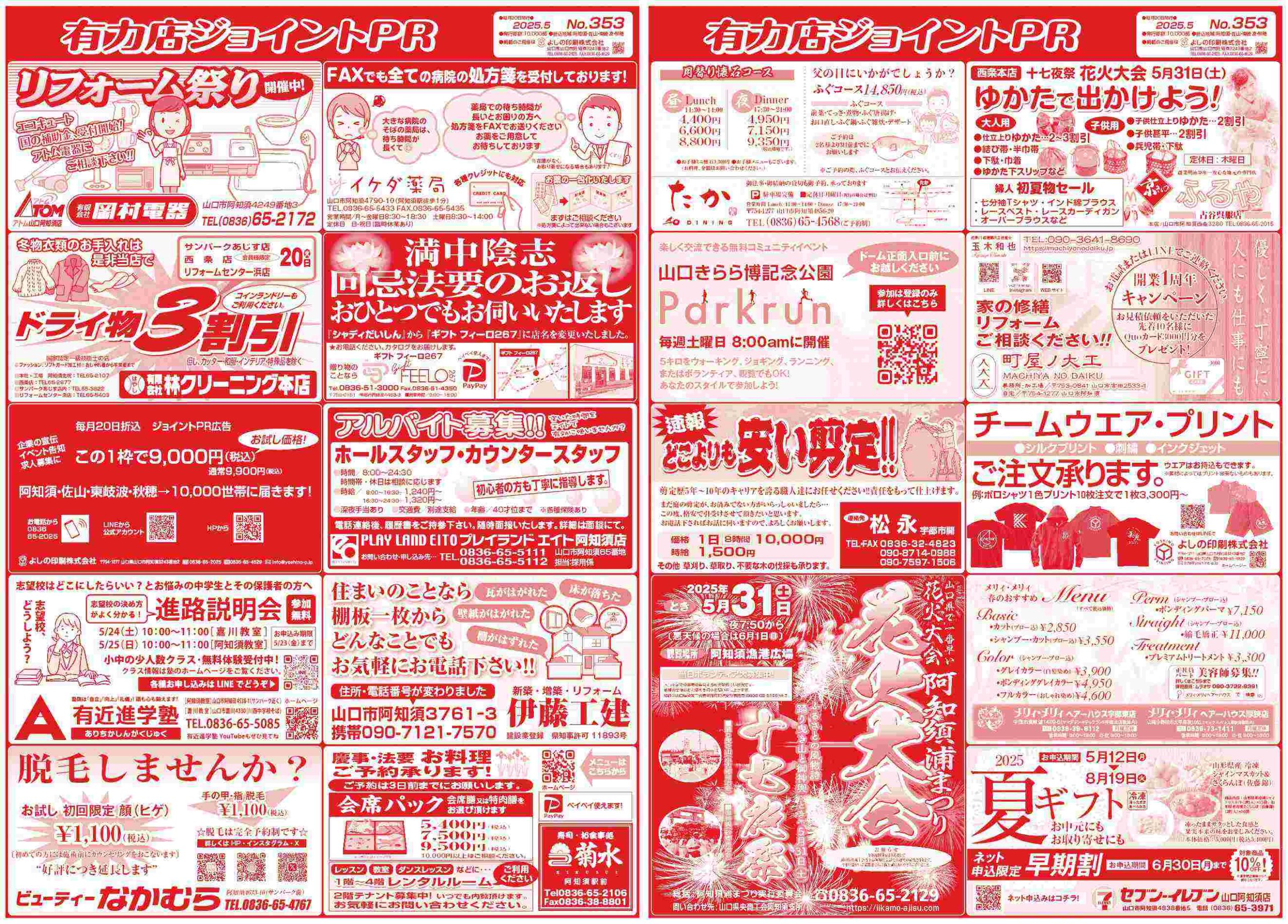 弊社で毎月20日に発行している新聞折込広告、ジョイントPRの5月号を発行しました。 お得な情報満載です!       今月の掲載 有限会社岡村電器様、有限会社林クリーニング本店様、有近進学塾様、ビューティーなかむら様、イケダ薬局様、ギフト フィーロ267様、プレイランドエイト阿知須店様、伊藤工建様、お食事処 菊水様、和ダイニングたか様、山口きらら博記念公園Parkrun様、松永剪定様、阿知須浦まつり実行委員会様、京きもの ふるや様、町屋ノ大工様、メリィ・メリィヘアーハウス宇部東店・厚狭店様、セブンイレブン山口阿知須店様...
